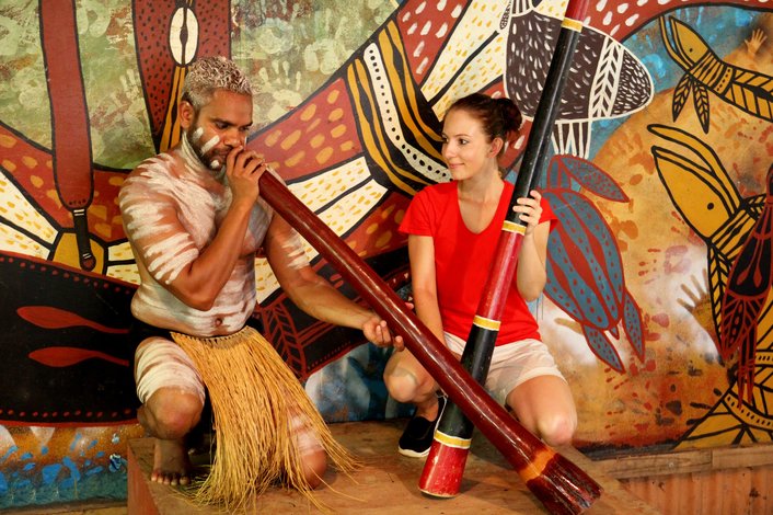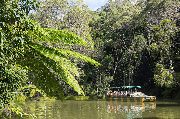 Travel to Kuranda aboard the Kuranda Scenic Railway with commentary - one of the world's most spectacular railways. Free time to explore Kuranda Village. Visit the award-winning Rainforestation Nature Park and experience the amphibious Army Duck Tour of the rainforest, wander through the tropical Fruit Orchard, enjoy the powerful performance of the Pamagirri Aboriginal Dancers in the rainforest amphitheatre, join your Pamagirri Guide on the Dreamtime walk or spear throwing and didgeridoo demonstrations, try your hand at boomerang throwing and get up close to the animals in the Koala and Wildlife Park. Return to Cairns on the Skyrail Rainforest Cableway and glide silently over 7.5km of pristine World Heritage Rainforest in gondola cabins.